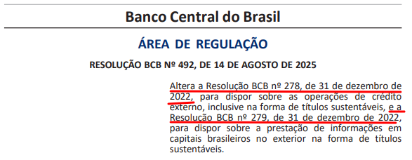 “Altera a Resolução BCB nº 278, de 31 de dezembro de 2022, para dispor sobre as operações de crédito externo, inclusive na forma de títulos sustentáveis, e a Resolução BCB nº 279, de 31 de dezembro de 2022, para dispor sobre a prestação de informações em capitais brasileiros no exterior na forma de títulos sustentáveis“, diz o documento a que a reportagem obteve acesso.