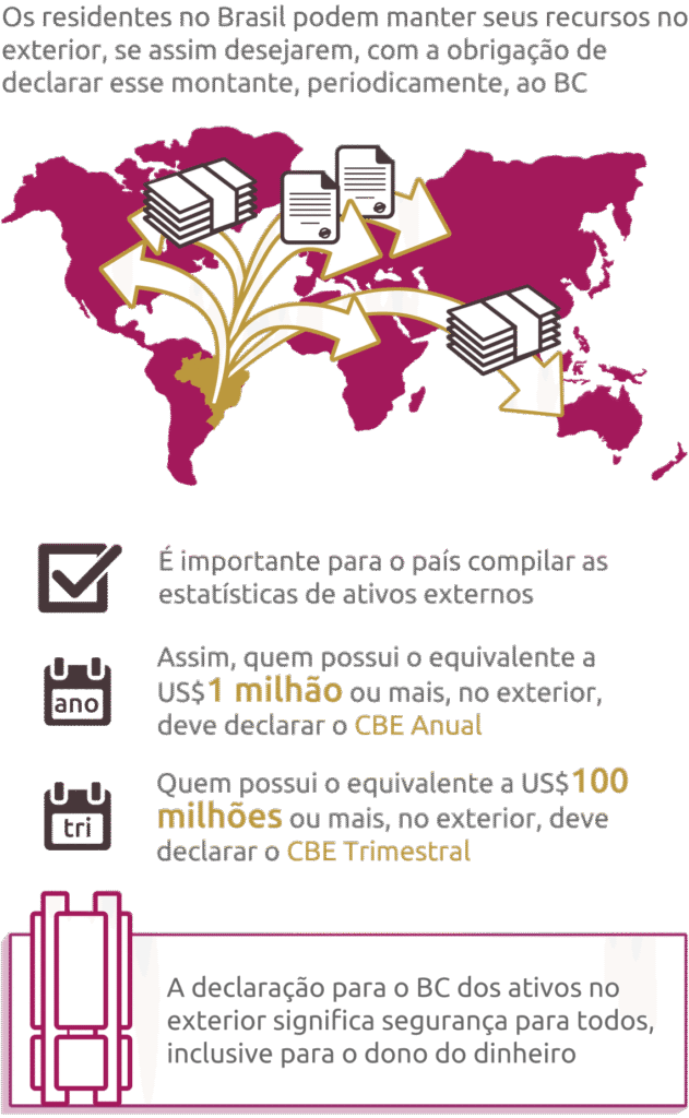 “Residentes no Brasil podem manter capital no exterior, desde que obrigatoriamente declarem ao banco central com frequência”, diz página oficial do CBE
